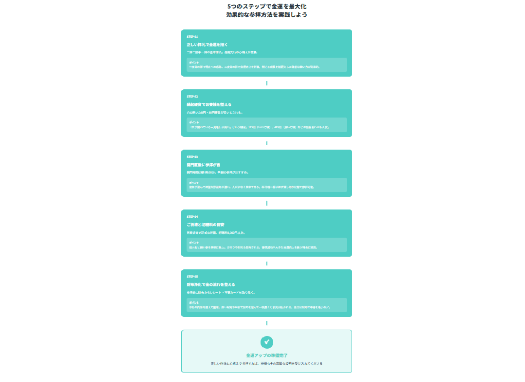 また参拝当日は、財布の中身を最小限にして神社へ向かうのがおすすめ。余計なものを持たず、心も軽やかな状態で神様と向き合うことで、より良いエネルギーを受け取れるとされています。