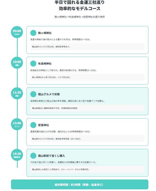 金運三社巡りの基本コースは、駒ヶ崎神社→布良崎神社→安房神社の順番で回るルート。総所要時間は約3時間で、半日あれば無理なく巡礼できます。