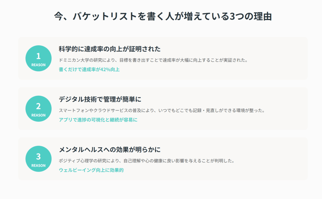 バケットリストは、人生をより充実させるための強力なツール。科学的な根拠に基づいた効果があり、現代のデジタル技術により誰でも手軽に始められるようになりました。