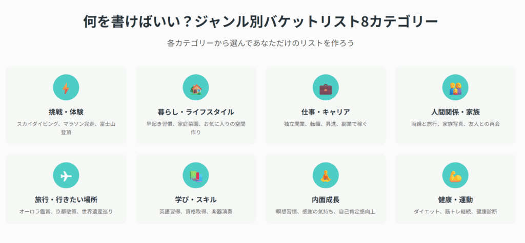 一般的な分類例としては、「旅行・冒険」「学習・スキル」「人間関係・家族」「健康・運動」「キャリア・仕事」「趣味・娯楽」「社会貢献・ボランティア」などが挙げられます。ただし、自分らしい分け方でまったく問題ありません。
