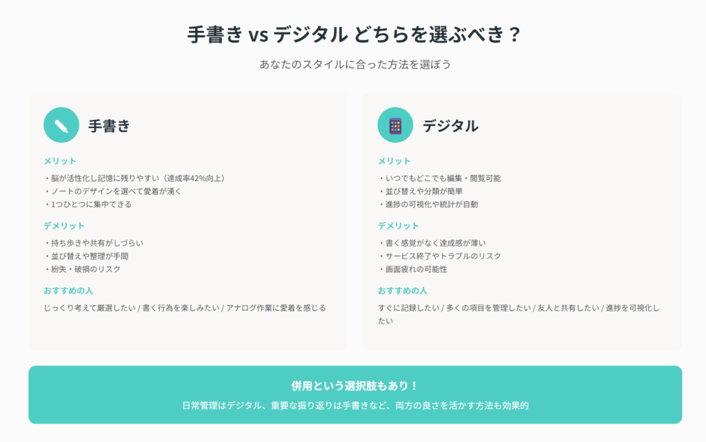 実は、多くの成功事例では手書きとデジタルの併用が採用されています。例えば、日常的な管理はデジタルツールで行い、重要な目標や年間の振り返りは手書きで行うという方法。
