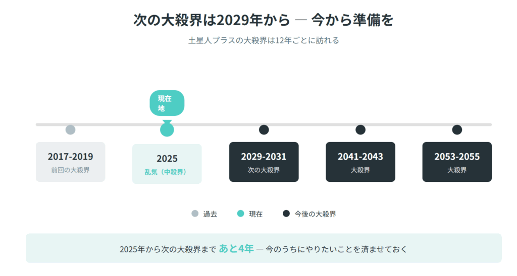 土星人プラスの次の大殺界は、2029年から2031年までの3年間です。 2026年現在は大殺界ではなく「乱気」(中殺界)にあたります。ここでは具体的な時期と特徴を見ていきましょう。