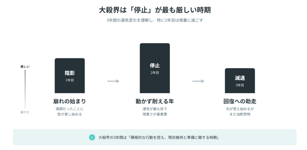 大殺界の3年間は、それぞれ異なる性質を持っています。段階的に変化していく様子を理解しておきましょう。
