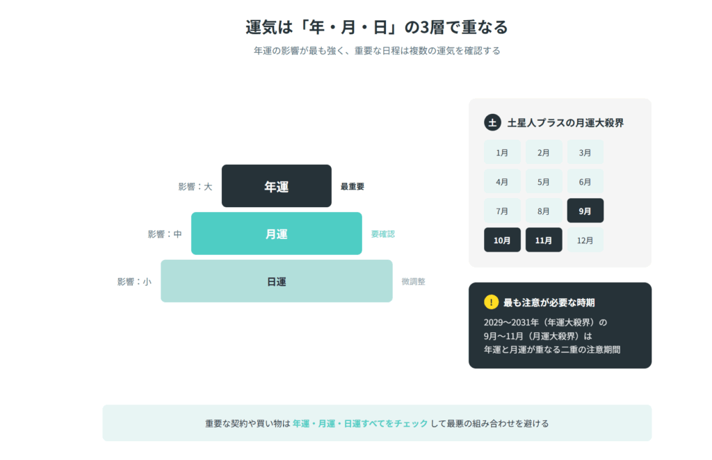 さらにリスクを下げたいなら、契約日や申請日を月運・日運で調整する方法があります。例えば、年運は大殺界でも、月運と日運が良い日を選べば、ある程度のリスク軽減が期待できるのです。
