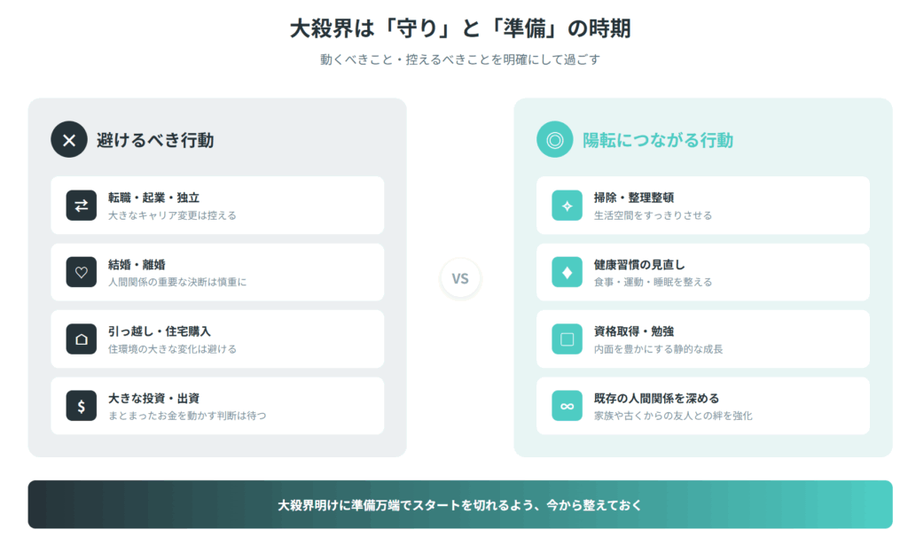 この時期は新しいことを始めたり、大きな決断をしたりするのに適さない期間とされています。転職や起業、結婚、マイホームの購入といった人生の重要な選択は、できるだけこの期間を避けることが推奨されているのです。
