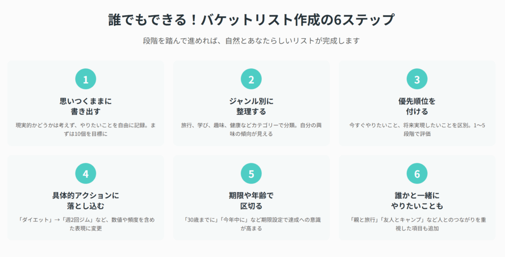 バケットリスト作りは、実はそれほど難しいものではありません。大切なのは、正しい順序で進めていくこと。一度にすべてを完璧にしようとせず、段階を踏んで作り上げていけば、自然とあなたらしいリストが完成します。