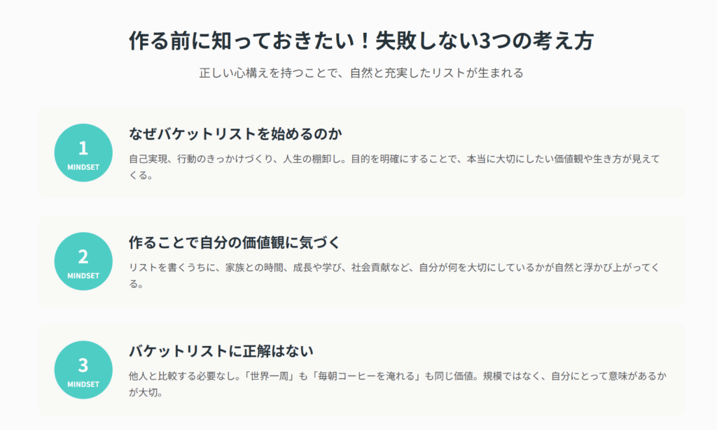 実は、バケットリスト作りで一番大切なのは、作成テクニックよりも「考え方」なのです。正しい心構えを持つことで、あなたらしい充実したリストが自然と生まれてきます。