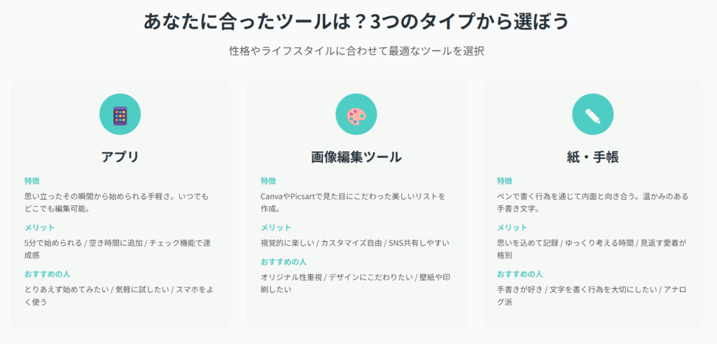 バケットリストを作り始める前に、まずは「どんな道具を使うか」と「どんな例があるか」を確認しておきましょう。準備をしっかりと整えることで、リスト作りがずっとスムーズになります。
