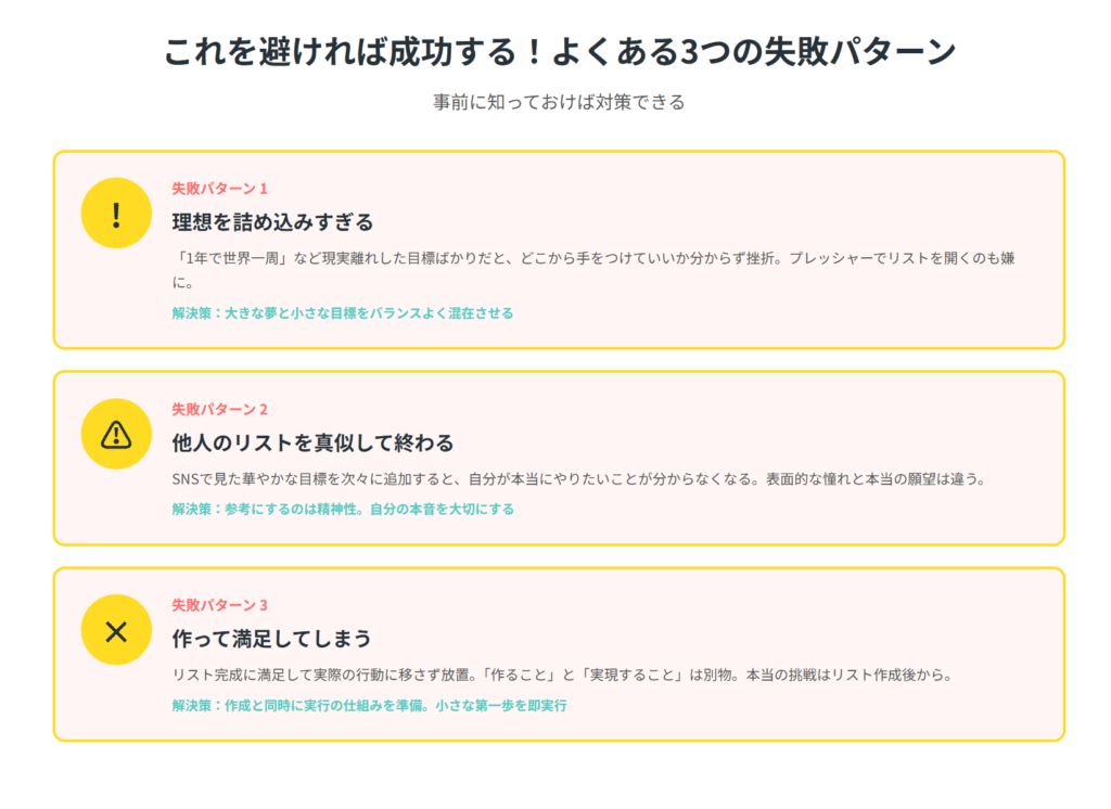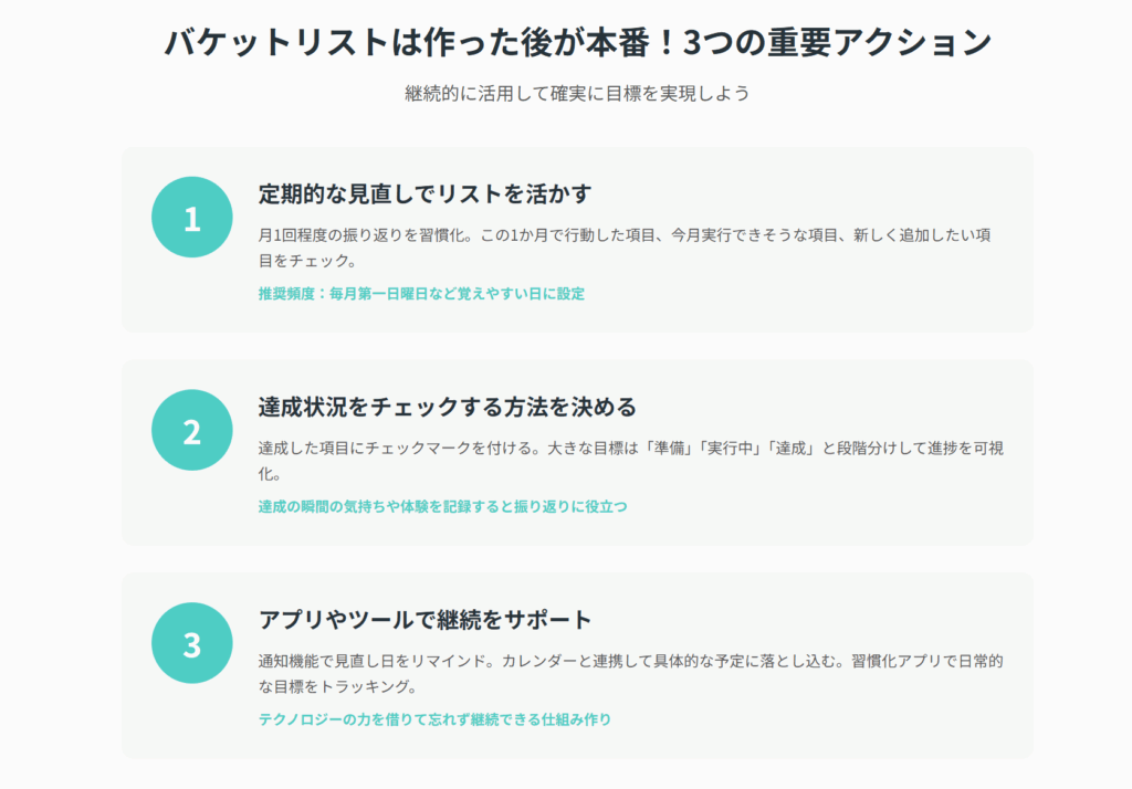 バケットリストは作ることがゴールではなく、それを実現することが本来の目的。適切な運用方法とツールの活用により、あなたの夢や目標を着実に現実のものにしていってください。