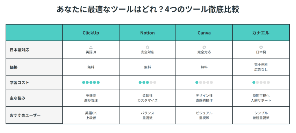 日本のユーザーにとって最も重要な日本語サポート状況を比較すると、Notion、Canva、カナエルが完全日本語対応を実現しています。特にNotionは2022年に日本法人を設立し、日本語カスタマーサポートも提供しています。