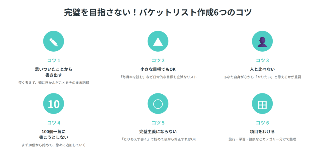 バケットリスト作成を始める際、多くの人が「何から書けばいいかわからない」「完璧なリストを作らなければ」と考えて手が止まってしまいます。しかし、効果的なバケットリスト作成には、完璧さよりも「まず始めること」が最重要。以下の6つのコツを意識すれば、誰でも無理なくバケットリスト作成をスタートできます。