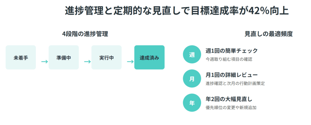 - 月1回の詳細レビュー:進捗確認と次月の行動計画策定