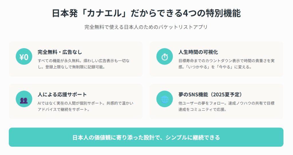 数あるバケットリスト作成ツールの中でも、特に日本のユーザーにおすすめしたいのが、2025年3月にリリースされたアプリ「カナエル」です。このアプリは単なる目標管理ツールを超えて、ユーザーの人生そのものを豊かにすることを目指した画期的なサービスとなっています。