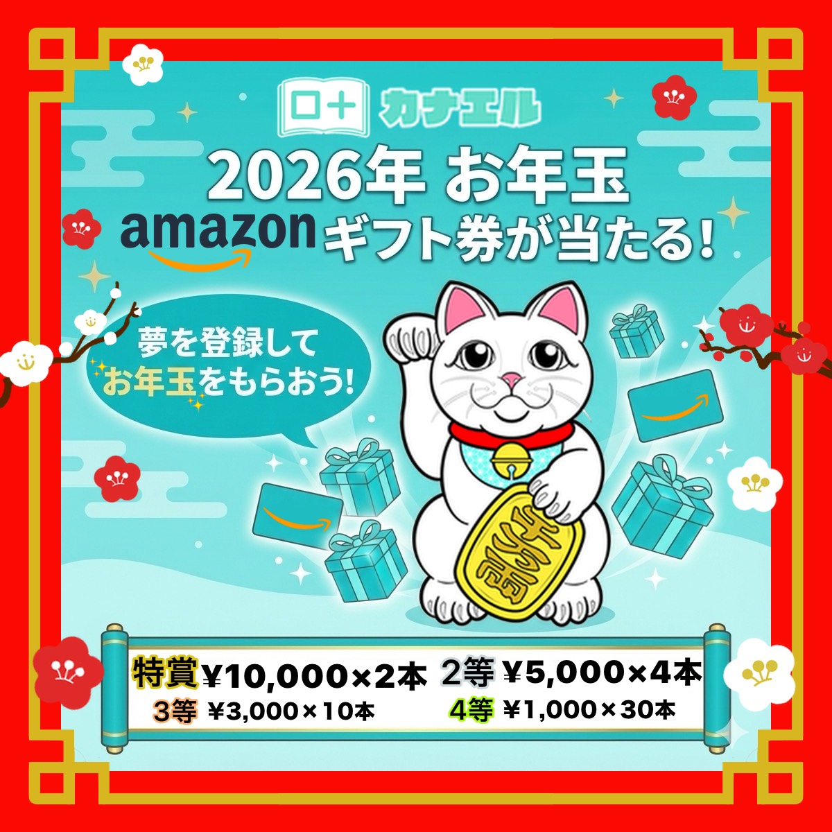 内容:期間中にアプリ『カナエル』へ夢を登録した方の中から抽選でAmazonギフト券をプレゼント